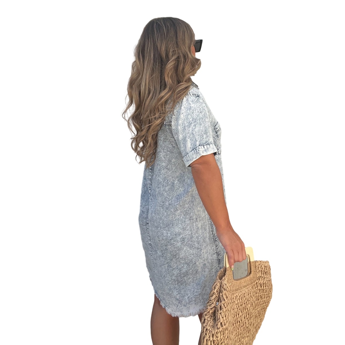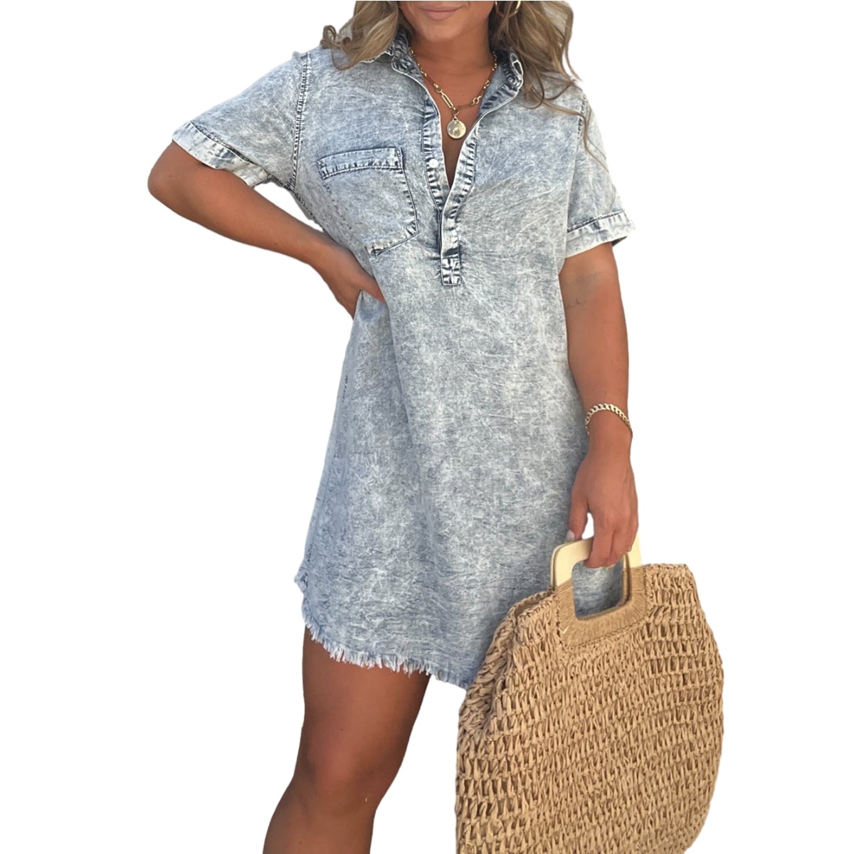 Elevate your wardrobe with our Women’s Washed Shirt Dress, a quintessential piece that blends casual comfort with chic style. This short sleeve denim shirt dress offers a timeless and relaxed look, making it perfect for a variety of occasions.